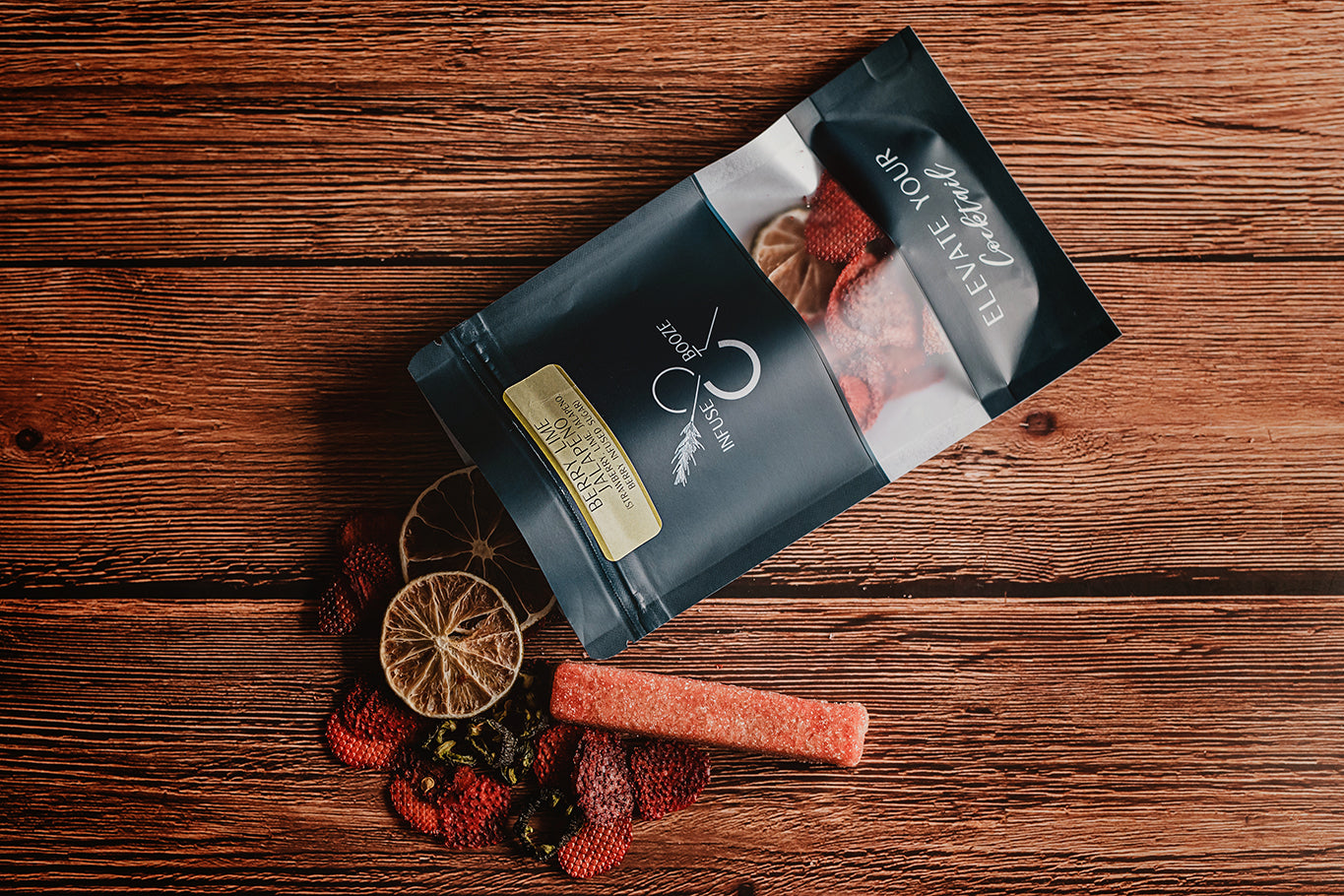 Infusion kit contains: strawberries, limes, jalapeno and berry infused non-GMO Vegan Cane Sugar.