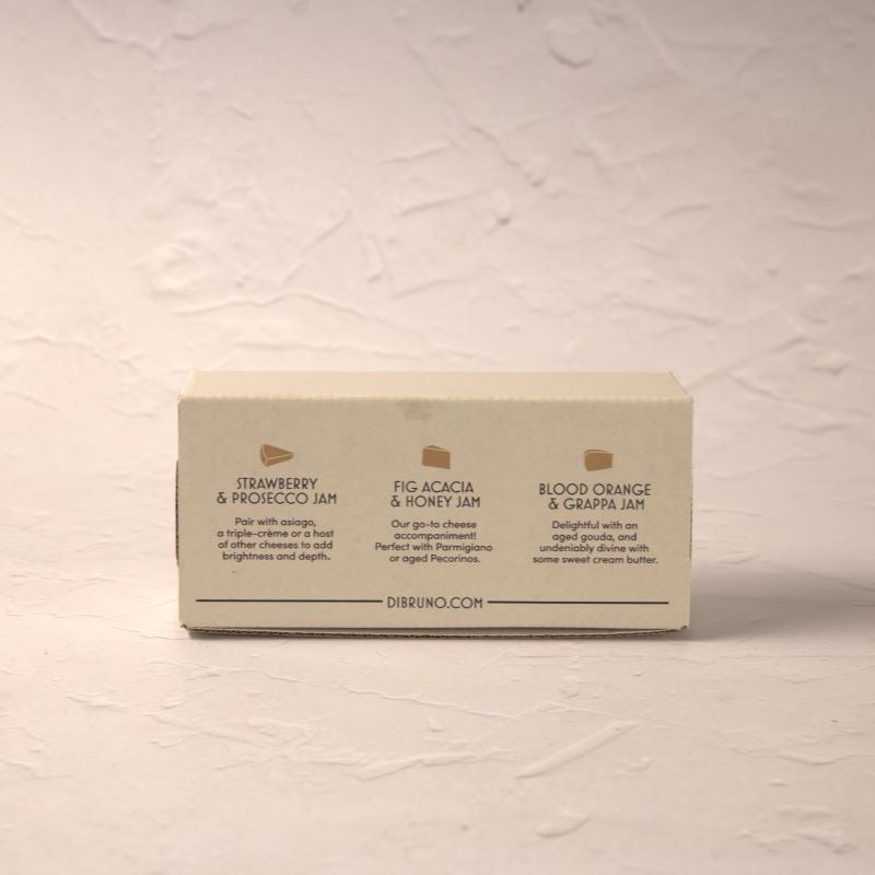 Di Bruno Bros. shares our culinary pioneering spirit by introducing the world to the very best Italian cheese pairing jams you can find. To produce exceptional jams, we start with exceptional produce. We then closely follow the many stages involved in the manufacturing process - you know, not too hot, not too long, etc. Made from fruits taken from the cleanest local farms and the additional ingredients lovingly worked into the recipe, this giftable box shows that jams don't have to be boring.