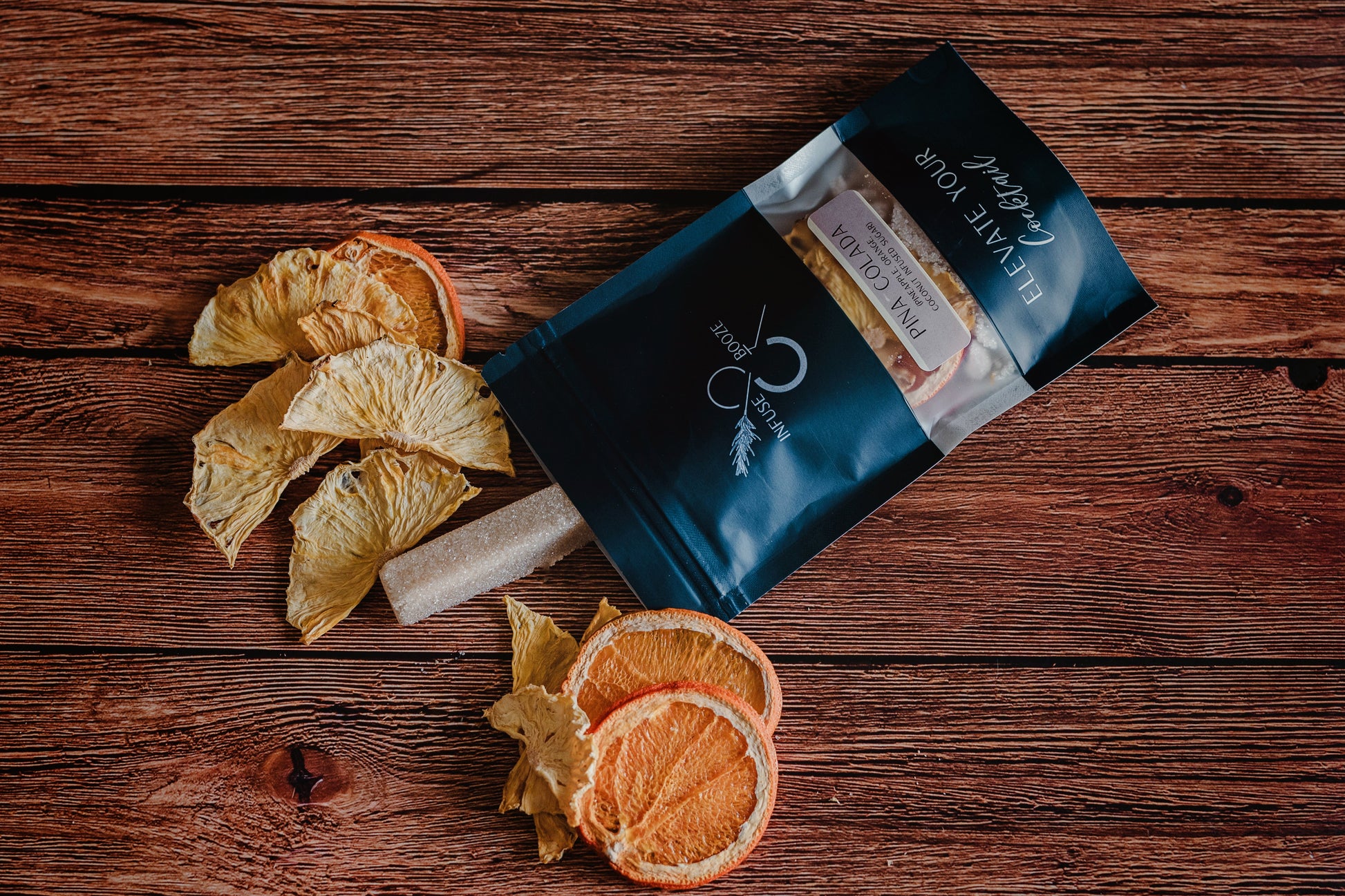 Infusion kit contains: pineapples, oranges and coconut infused non-GMO Vegan Cane Sugar.